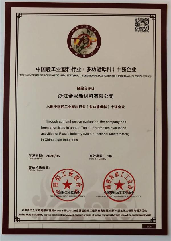 浙江金彩新材料有限公司榮獲“中國輕工業塑料行業(多功能母料)十強企業”稱號,金彩的“高品質原液著色聚酰胺纖維產業化技術開發項目”榮獲中國塑料加工行業“十三五”“優秀科技成果”。