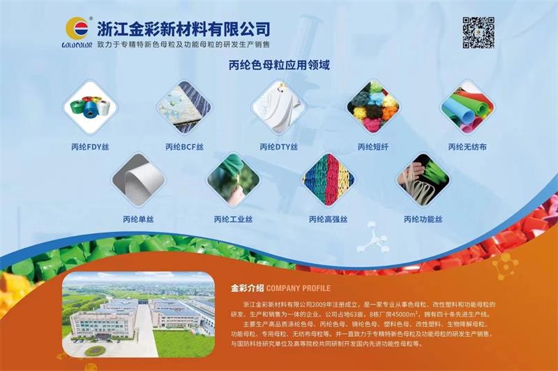 浙江金彩新材料有限公司是一家專業(yè)從事專精特新色母粒及功能母粒研發(fā)、生產(chǎn)和銷售為一體的國(guó)家高新技術(shù)企業(yè),主要生產(chǎn)高品質(zhì)滌綸色母、丙綸色母、錦綸色母、塑料色母、改性塑料、生物降解母粒、功能母粒、專用母粒和無(wú)紡布母粒等。